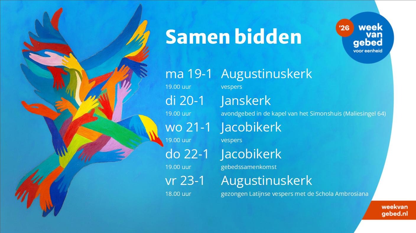 De Week van gebed voor eenheid van christenen 2026 moedigt kerken aan om in te gaan op het geloof dat alle christenen verenigt. Tijdens de Week van gebed voor eenheid bidden wereldwijd miljoenen christenen voor eenheid, vrede en gerechtigheid. Door samen te bidden ervaren we dat we verbonden zijn, met God en met elkaar. Tegelijk tonen we verantwoordelijkheid voor anderen door de problemen van de samenleving in de voorbeden een plek te geven. In 2026 vindt de gebedsweek plaats van 18 tot en met 25 januari.